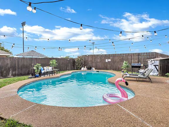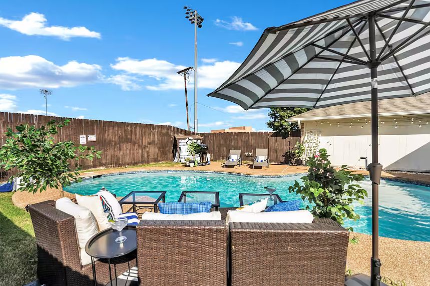 Welcome to our luxurious 1-story pool house in Allen! This 1948 SF, professional designed retreat offers the perfect balance of relaxation and entertainment. Enjoy a refreshing swim in the pool, challenge friends to Jumbo Jenga, fire up the grill for a delicious barbecue on the patio, and a fire pit for marshmallow wars. This is your headquarters for non-stop fun and outdoor shenanigans!. Unwind, have fun, and make lasting memories in this exceptional vacation home.