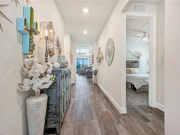 Welcome to Paradise in sunny, SW Florida! This gorgeous single family home has 3 bedrooms, 2 bath which features an extra large great room / living room / kitchen, an open floor plan with lake views is perfect for your primary residence or a second home. The kitchen has granite countertops, stainless steel appliances and a tiled back splash along with plantations shutters throughout. This home has wood plank ceramic flooring throughout with carpet in the bedrooms. The fenced in yard is perfect for pets and space to build a private pool along with an extended lanai. The property features exquisite landscaping, built-in irrigation and a paver driveway. Hampton Lakes at River Hall is a gated community which offers numerous amenities including: a clubhouse, olympic-style pool, fitness center, tennis, basketball, bocce ball, pickle ball and an optional golf membership is available for access to an 18 hole golf course. Enjoy the convenience of being minutes away from shopping, schools, restaurants and other outdoor activities.