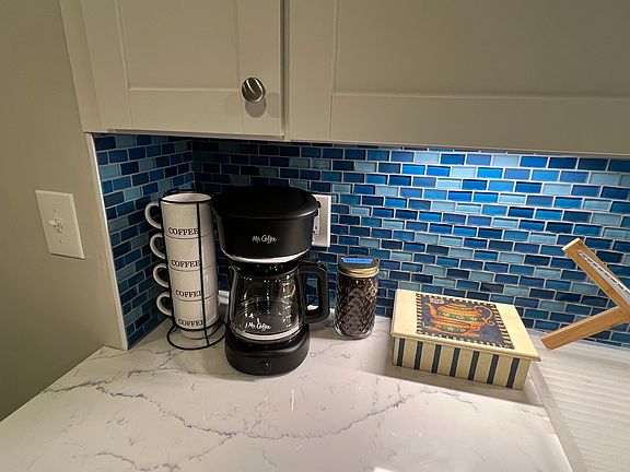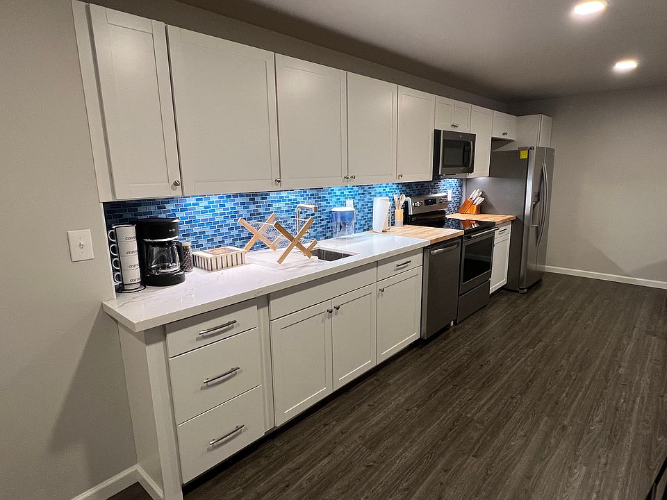 Queen sized bedDimmable lightsComfy couchBlue tile backsplashDressers and nightstandsBrand new full kitchenWhite quartz countertop