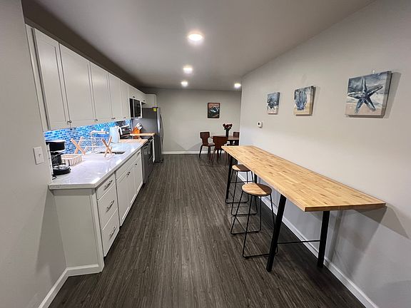 Freshly renovated, cozy Mother-in-Law apartment on 2.5 forested acres on the Anchorage Hillside. Our two bedroom, 1 bath apartment is fully furnished and features a brand new, full kitchen with full size stainless steel fridge, oven, microwave, dishwasher, and coffee maker. The kitchen is light and bright with a new white quartz countertop, white cabinets, and blue tile backsplash that is highlighted by dimmable under-cabinet lights.