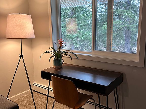 The large living room includes dimmable lights that can be bright for productive times or low for relaxing. A large and easy to use 75" Roku Smart TV is included for entertainment while relaxing on the comfy couch after work. There is also a desk with a peaceful view of the forest surroundings.