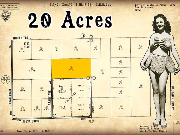 This 20-Acre land parcel is for sale on Araby Avenue in Twentynine Palms, CA. It is a HUGE property that has access to both water (buyer, please verify with 29 Palms Water 760-367-7546) and electricity (along the south side). Great views to the north and south, this land is close to town for all of the amenities, but outside it enough for a rural feel. Perfect for a high desert ranch.