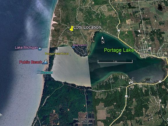 Wooden lot to build your special home out on Portage Point within one mile of Lake Michigan public beach and Portage Lake. Corner property. About a mile to the boat launch.The seller has 4 separate lots for sale in this general location. See aerial of the lots in the documents. One hour to Traverse City. Located a short distance off M22 scenic drive. Close to several championship golf courses including Arcadia Bluffs. Easy drive to orchards and wineries. World class fishing on Portage Lake, Lake Michigan, and area rivers and streams. Close to the snowmobile trail system.