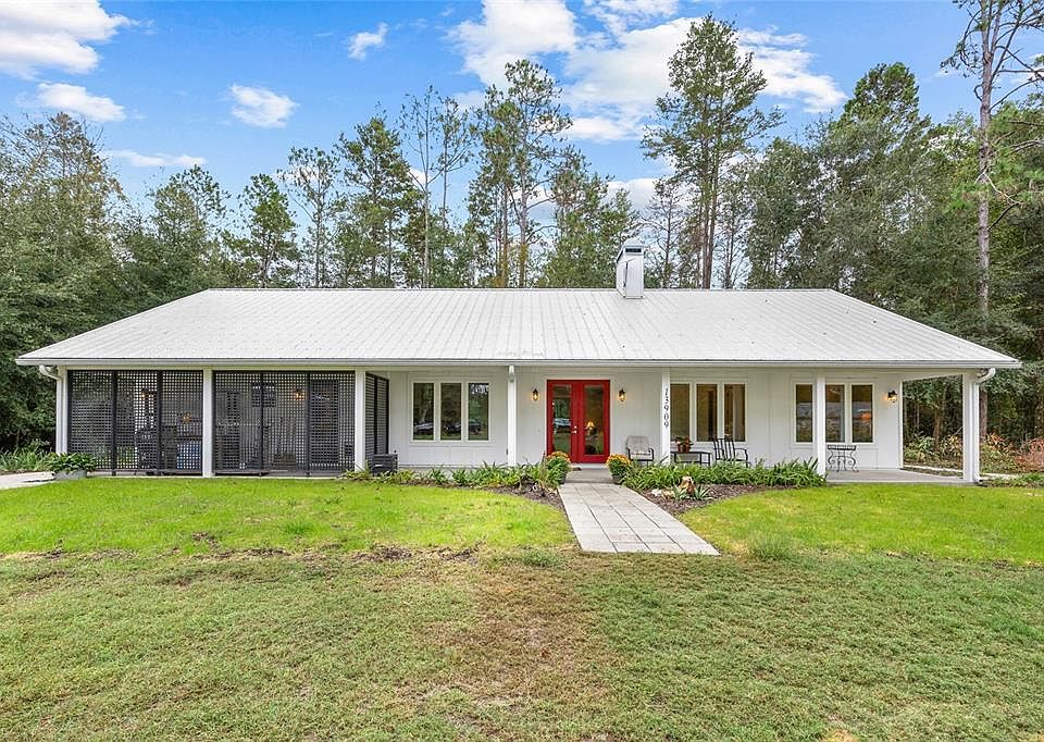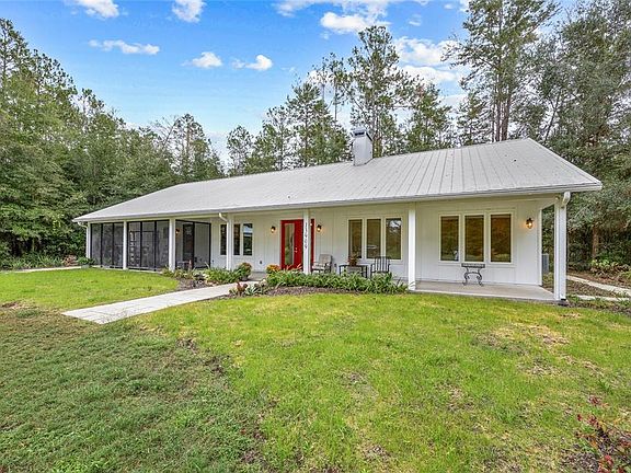 One or more photos were virtually staged (fire shown in fireplace). Offering a peaceful country lifestyle without sacrificing city convenience is this hidden gem in Grassy Lake Estates less than 10 miles from University of Florida! Sitting on 6.32 gorgeous acres zoned for horses is not 1, but 2 homes! There’s a stunning like-new 1,872 sq ft 3-bed, 2-bath home built in 2018 by Robinson Renovation & Custom Homes, Inc., and an adorable 900 sq ft 2-bed, 1-bath guest house built in 2021. The exquisite modern farmhouse features 10 ft ceilings, high-end finishes, a sophisticated neutral palette, porcelain wood-look tile, Corian countertops, and tranquil vistas throughout. Stepping indoors you will find yourself in a huge great room that highlights a wood-burning fireplace, a clever barn door covering the TV, and glass doors overlooking the private backyard. Custom lighting showcases the dining area and designer island kitchen packed full of elevated aesthetics including stainless steel appliances, focal-point range hood, classic white subway tile backsplash, and custom cabinetry. A split bedroom plan has the primary suite off the kitchen. The spacious suite includes a barn door entry into the sizable ensuite boasting double sinks, bathtub, huge walk-in shower, and white subway tiles. On the other side of the home are two guest bedrooms with upgraded closets and a full guest bath featuring a glass-enclosed walk-in shower with white subway tiles, consistent with the home’s style. There is an office with large windows and glass doors for privacy, an efficient laundry room with cabinets and shelving, a welcoming front porch that has a screened area with a garden potting sink, and a covered back porch running the length of the home. Additional bonuses include a new water treatment system, spray foam insulation in the attic, and a 3-bay carport. Located in Archer, the property is an easy commute to top medical facilities like UF Health Shands Hospital and HCA Florida North Florida Hospital. Excellent shopping and dining are easily accessible, with Celebration Pointe, Butler Town Center, and the unique boutiques and restaurants of Haile Village Center all within a comfortable driving radius. Outdoor enthusiasts will appreciate the proximity to nature parks and trails, including the Gainesville-Hawthorne State Trail for biking and hiking. This location truly captures the essence of private country living while keeping all of Gainesville's major employment, entertainment, and retail centers well within reach. If you have been dreaming of a luxurious home in the country close to town where you can create a homestead or bring your horses, don’t let this opportunity pass you by!