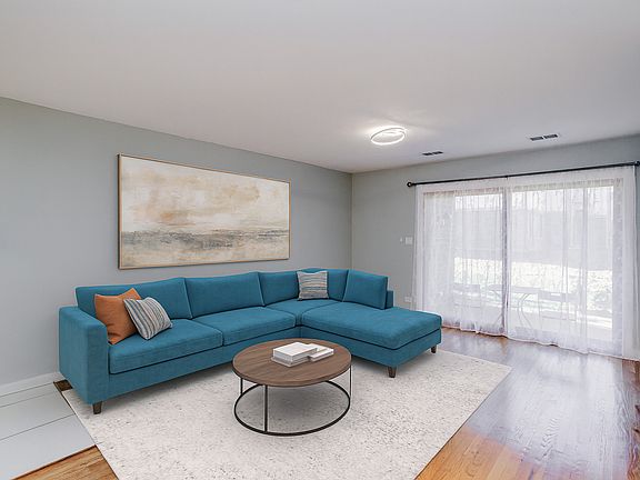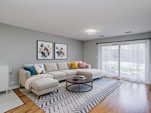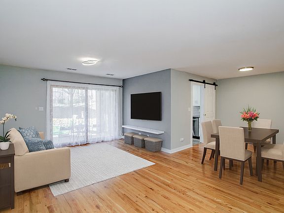 Welcome to this beautifully updated 2-bedroom, 1-bath first-floor home in the desirable Pheasant Trail subdivision of Arlington Heights, offering a 1-car garage, an additional exterior driveway space, and ample guest parking. Enjoy a spacious layout featuring hardwood floors in the living and dining rooms, carpeted bedrooms, double-pane windows, and large glass sliding doors leading to a 13' x 11' concrete patio overlooking peaceful green space with a 6' x 4' storage area-perfect for relaxing or entertaining. The modern kitchen (remodeled in 2020) impresses with soft-close white cabinetry, quartz countertops, white-and-gray timeless backsplash, LED under-cabinet lighting, deep stainless-steel sink with modern faucet, heated tile floors, stainless-steel appliances including a large fridge, range with stainless-steel hood, dishwasher (2024), garbage disposal, LED recessed lighting, and a reverse osmosis water filtration system, plus room for a breakfast table overlooking the patio. The fully remodeled 2022 bathroom showcases floor-to-ceiling porcelain tile, heated tile floor, heated towel rack, sleek vanity, LED light fixture, and a contemporary mirrored upper cabinet, all enhanced by a space-saving pocket door. The primary bedroom features an impressive 8' x 6' walk-in closet, and a second generous size bedroom. Additional highlights include a ready-to-use TV bracket with shelf, contemporary dining room fixture, and furnace/AC replaced in July 2021. The large garage includes a Chamberlain 1/2 HP opener. Located minutes from transportation, shopping, golf, entertainment, Route 53, Deer Park Town Center, and steps from Buffalo Creek Forest Preserve with 5.5 miles of walking trails-plus moderate taxes and a low $275 assessment covering water, parking, exterior maintenance, lawn care, scavenger, snow removal, and insurance. Quick closing possible. Click the Virtual Tour for an immersive experience-move in, enjoy, and make this exceptional home yours today!