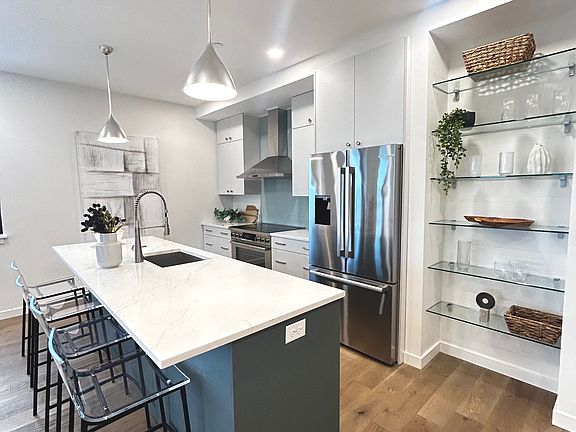 The chef-inspired kitchen features a stunning light blue backsplash, offering both style and ample room for culinary creativity. The bathroom is a true retreat, with striking tiled showers that combine unique design with a calming ambiance.