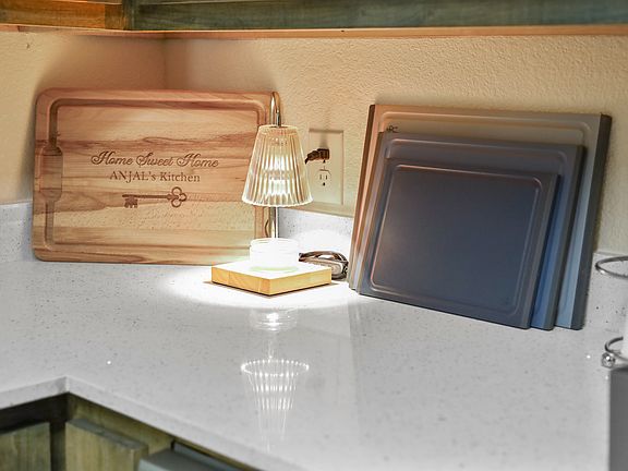 Soothing neutral color palettePlush furnishingsStunning granite countertopsHigh-chair bar areaSpacious cabinetsNatural gathering spot
