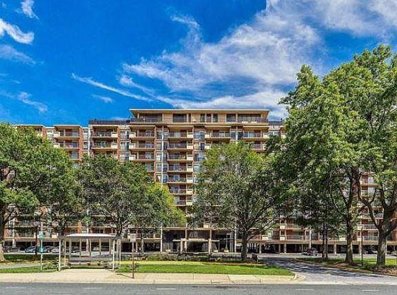 The building provides impressive amenities including a rooftop deck with panoramic views of DC, an outdoor pool, tennis court, landscaped grounds, picnic area, community room, 24-hour front desk, and an additional storage unit. The building is dog-friendly.