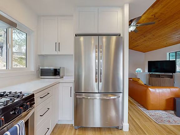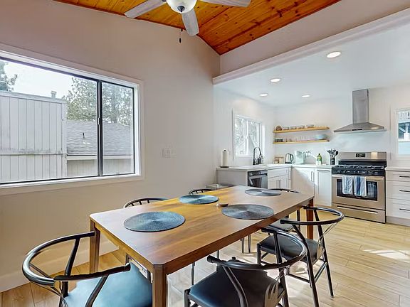 Wonderful patio with the view of the evergreen to relax, entertain, and barbecue. Beautiful vaulted wood ceiling in living room, dining room that opens to the kitchen (stove, dishwasher & refrigerator are included in rent). Laundry area with washer and dryer included. Central heat throughout the house and air condition on the top floor.