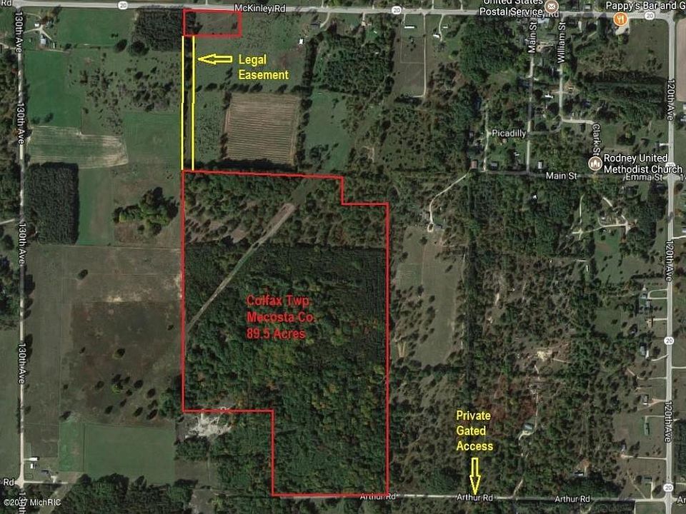 Here's your chance to own your next private hunting retreat in beautiful Mecosta County just outside the village of Rodney! With almost 90 total acres and access by either legal easement off of M-20 from the 2 acre lot (with the potential to build a home and/or cabin!) that is included or by gated private access at the end of Arthur Road, this property offers great seclusion for both you and the wildlife! There is a great variety of both open areas for food plots and woods for cover to keep those big bucks and gobblers on the property! A trail system provides for access throughout the property and runs from one end all the way to the easement on the other end! There was a select cut at the southern end of the property that has allowed for new growth, which has created more thick areas great for cover and bedding. Mecosta County has been producing nice bucks in the past several years and this property has the potential to do the same so don't hesitate & call today for your private tour