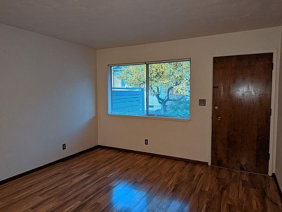 Two-bedroom, one-bath apartment central to downtown. New laminate flooring, hardwood floors, and fresh paint. Open kitchen and living-dining area. Large closets, ample front patio, and washer and dryer on site. One covered parking space. 11-month lease, then month-to-month.