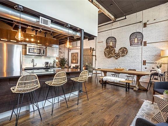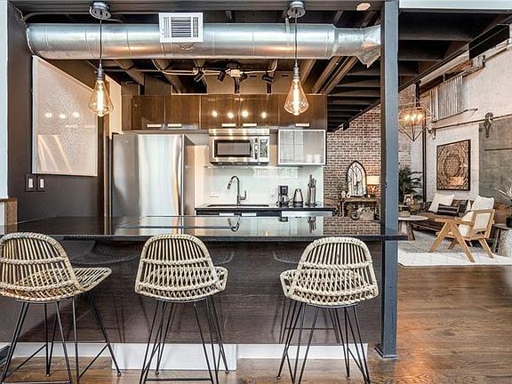 Experience elevated loft living in this stunning two-story residence at the historic Troy Peerless Lofts, ideally located across from Ponce City Market in the heart of Old Fourth Ward. Originally built in 1920 and masterfully converted into luxury lofts, this furnished 2-bedroom, 1.5 bath home seamlessly blends historic character with modern sophistication. Inside, soaring ceilings, exposed brick walls, and oversized windows fill the space with natural light. The open-concept main level features a spacious living area, dining space, and a sleek modern kitchen all curated with upscale, tranquil decor that creates a sense of effortless luxury. The primary bedroom is located on the main level, offering a peaceful retreat with beautiful design details and easy access to the full bath. Upstairs, a second bedroom overlooks the living area below, ideal for guests or a stylish home office. Just steps from the Atlanta BeltLine and directly across from Ponce City Market's world-class dining, shopping, and entertainment, this loft offers the perfect balance of historic charm and contemporary comfort in one of the city's most desirable neighborhoods.
