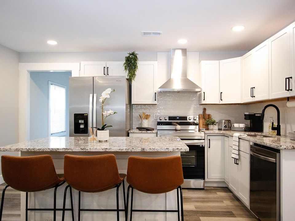 Modern backsplashStainless steel appliancesPerfect breakfast roomShaker cabinetryLuxurious granite countertopsSplit-level floor planPrivate master suite