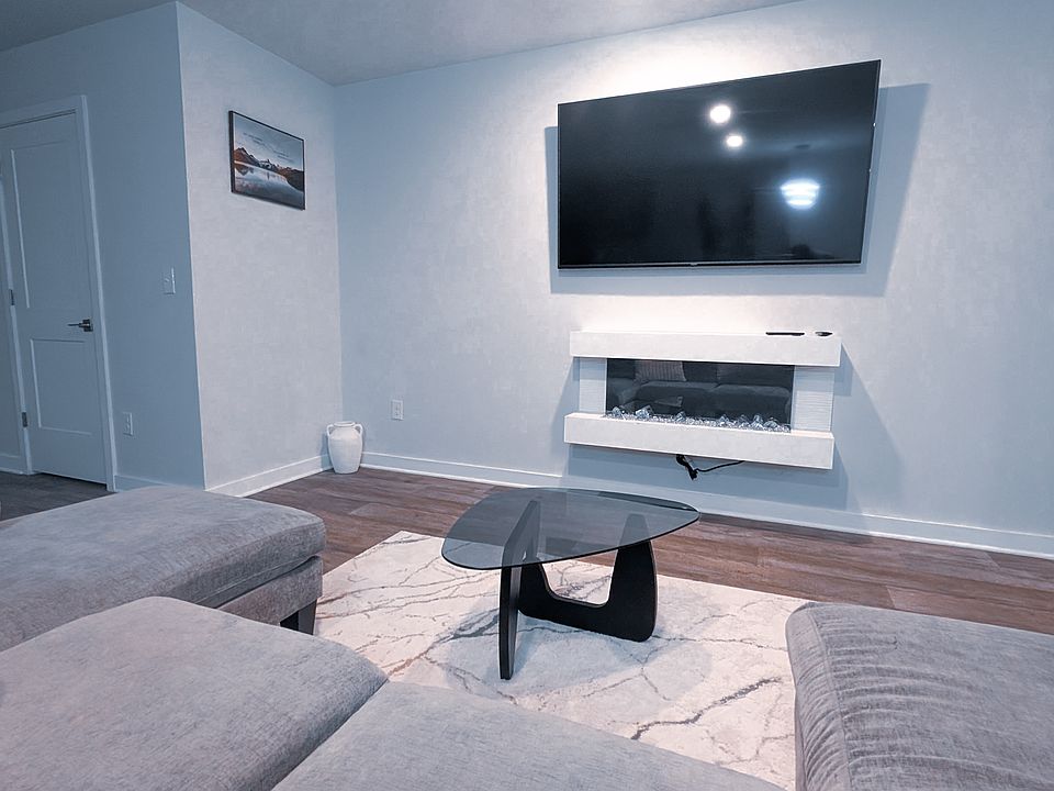 Small loftOpen concept first floorSpacious family roomStreamlined kitchen