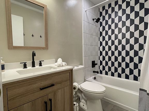 Lovely tile surroundCentral air conditioningNewer quartz countertopDedicated parking spotsOutdoor shower
