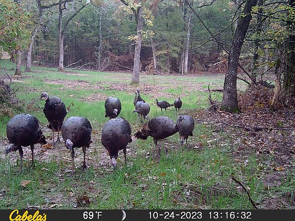 We were provided with a very nice set of trail camera photos showing a nice set of younger bucks that are well on their way to being shooters. In addition, a group of does are also hitting the food plots. There are several locations along the creek where large trees have limbs that extend across the creek creating ideal wild turkey roost locations. The presence of turkeys on the food plots leads us to believe that they are likely to roost along the creek and then routinely work their way up to the feeders and food plots.