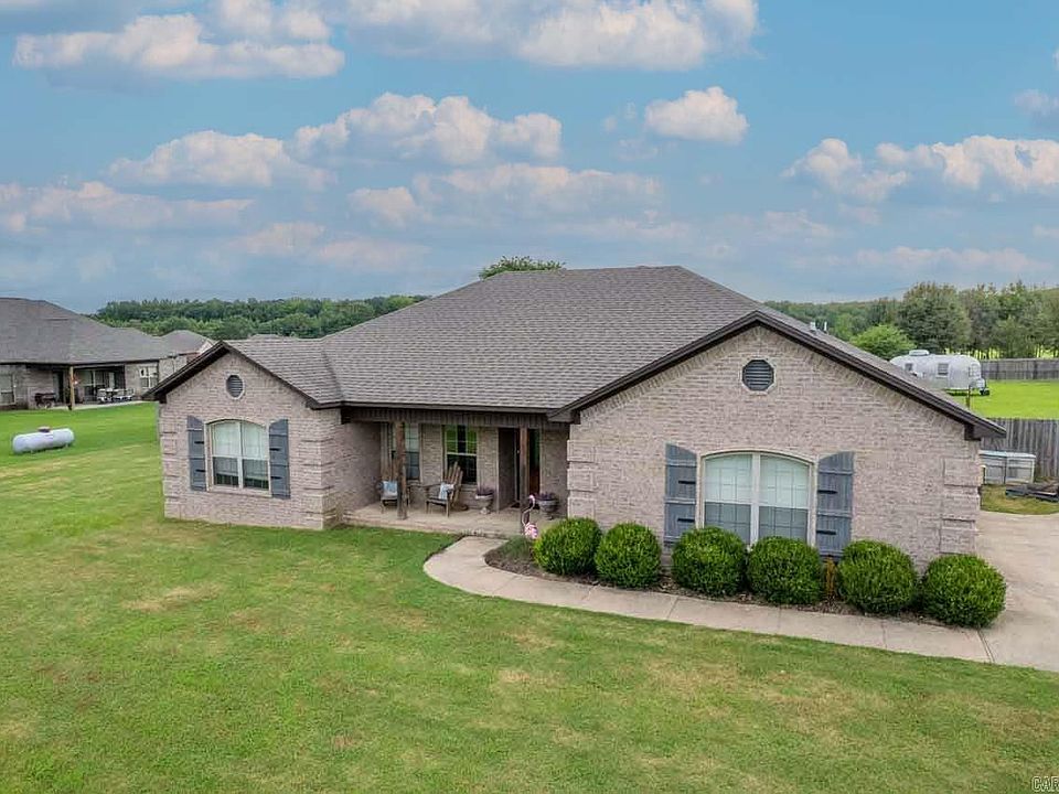 Sitting on an acre, this beautiful home has granite countertops throughout with a spacious master suit with separate jetted tub and tiled shower. French doors in the open concept living area lead to a covered porch in fully fenced, large backyard. Patio area access from the master suite as well. Sit on your covered front porch and enjoy the pond and tons of wildlife. Mud room area off of garage perfect for backpacks and shoes. Walk in storm shelter in garage for added protection. This property has it all!