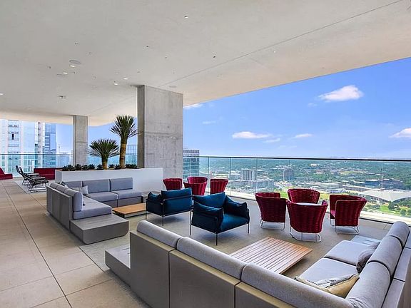 Experience downtown living at this 11th-floor condo located in a lock-and-leave community. This 2-bedroom, 2-bathroom unit boasts contemporary design and breathtaking views of the city lights. The unit has a modern interior featuring hardwood flooring, white walls, tall ceilings, and exposed concrete accents with a lot of natural light. The spacious living/dining room offers floor-to-ceiling windows with automatic double shades, providing panoramic views of the city. The unit has a custom walk-in closet and an attached bath featuring a deep soaking tub, and a frameless walk-in shower. It has a full-size laundry room with custom cabinetry, and two premium parking spaces near the elevator. The unit also features a custom closet in the second bedroom and a shoe rack. The attached private balcony opens to the ladybird lake. The community includes an array of amenities, including a resident lounge, fitness center, children's playground, dog park, and an infinity edge heated pool overlooking Lady Bird Lake and Shoal Creek.