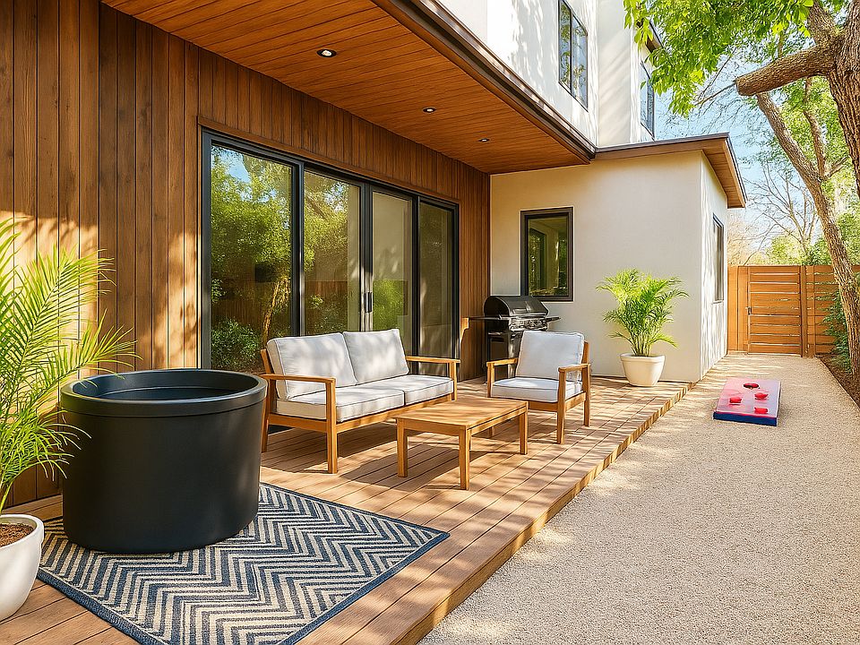 Welcome to your ultimate outdoor retreat! Start your day with an invigorating cold plunge, then unwind on the spacious deck, furnished with cozy chairs and sofas. Cool off in the refreshing 10' Cowboy pool on sunny Austin days, or heat it up for a warm, relaxing swim on cooler nights. Fire up the BBQ grill for an authentic Texas cookout.