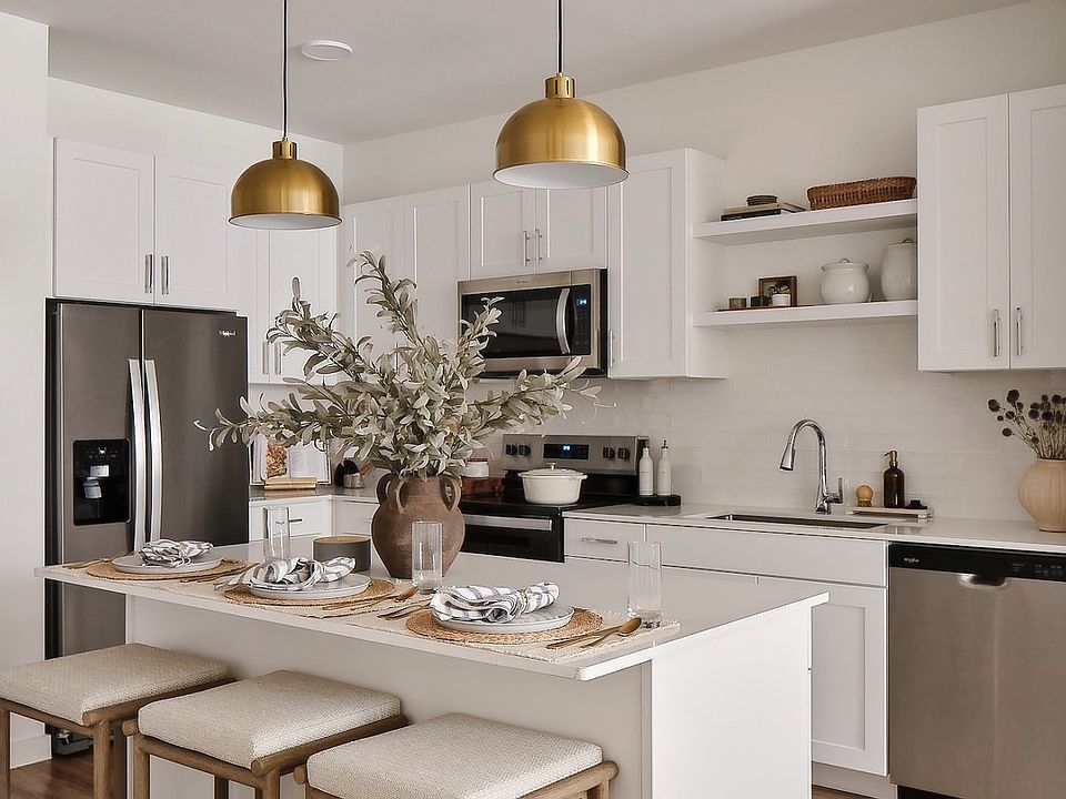 Kitchen has a prep island, quartz counters, and stainless appliances.