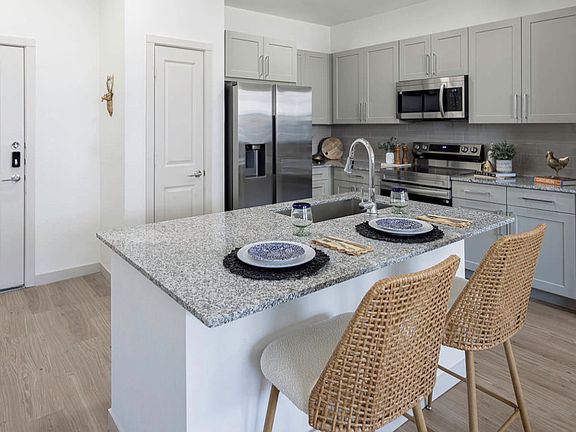 Small courtyardGranite countersHuge islandGym and coworking loungeFull-size laundryBright open feelGrill stations