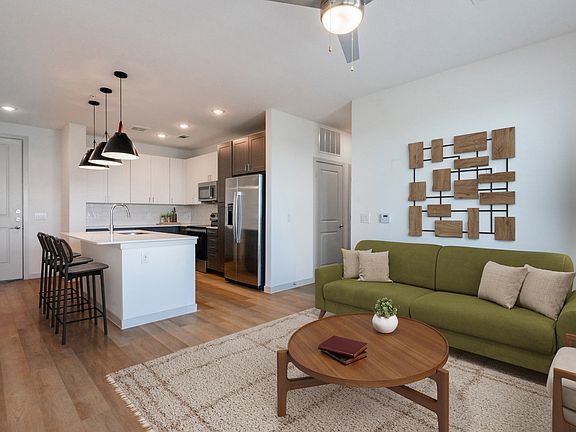 Modern apartment homes featuring open-concept layouts, quartz countertops, wood-style flooring, stainless steel appliances, and in-unit washer and dryer. Select homes include private yards or balconies.