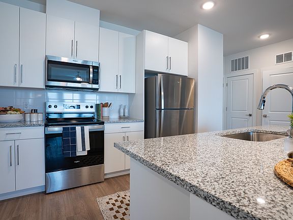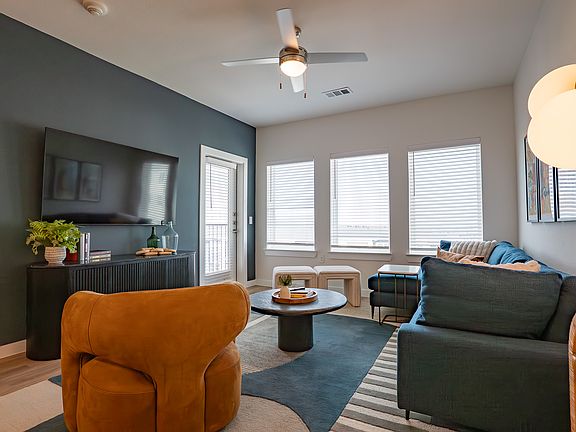 Community perks include a resort-style pool, fitness center with yoga and spin studio, pet park and spa, clubhouse with demo kitchen, co-working spaces, and EV charging stations. Now offering one month free on select leases.