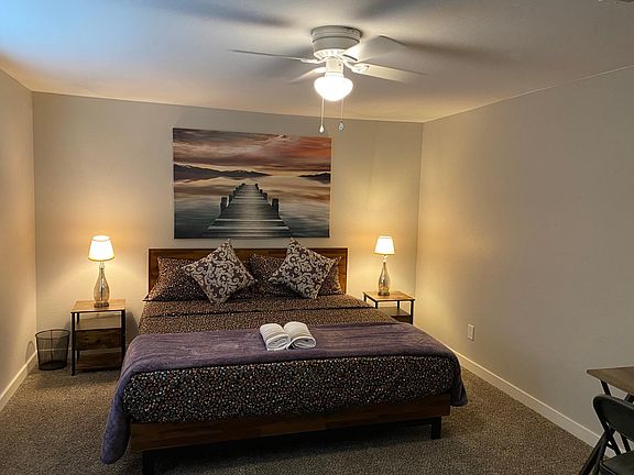 Guest Bedroom 1: This bedroom comes with King bed and a standard closet. The is the largest of all bedrooms. It comes with desk and a chair if you would like to use it while working remotely on your laptop. It also has wall mount 50 inch TV.