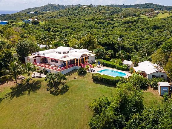 Quiet Pilón property on 2.63 cuerdas with 5 bedrooms and 4 bathrooms across three living spaces. The main house has 2 bedrooms, 2 baths, a chef’s kitchen, dining area, and decks with water views. A swimming pool separates a 2-bedroom casita with kitchen and bath from the main house, and a 1-bedroom apartment with private access adds extra space. Set among fruit trees and tropical gardens, the property has plenty of room to expand and is just 10 minutes from some of the best spots that Vieques has: Sun Bay, Playa Negra, and Esperanza.