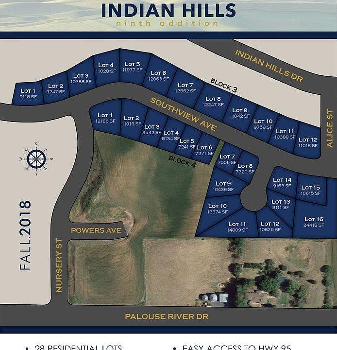 Every lot situated within the new residential subdivision of Moscow, Indian Hills 9th addition, brags ..."I'll Charm Your Socks Off"! A multitude of varying features to select the perfect place to build a custom home. Majority of lots boast expansive square footage with 1/4 acre to nearly 1/2 acre in size. Other lots will accommodate single level homes or adjoin the future Palouse Prairie Charter School. Nearly all lots will feature gorgeous southern views of Paradise Ridge. Completion slated for Fall 2018.