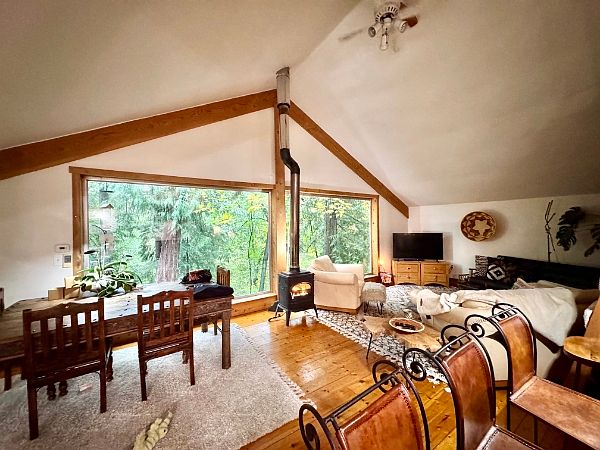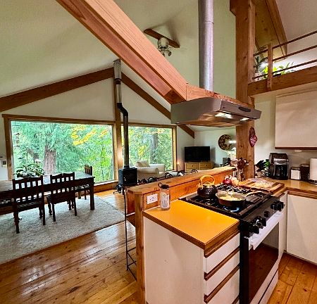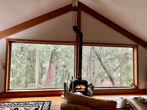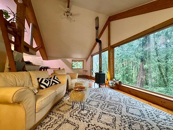 This secluded private home at the end of the road offers large windows with lots of natural light. Nestled among large cedars near a salmon stream, this uniquely crafted home features vaulted ceilings, wood floors and a gas fireplace, creating a feeling of a warm and cozy space while being connected to the outdoors. Great neighborhood for walking and biking and next to trails connecting to the Grand Forest.