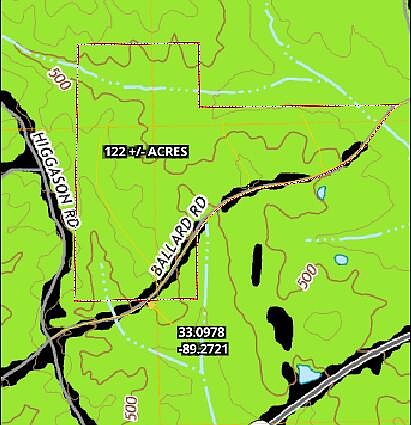 This 122 +/- acre property is a great hunting spot with most of the property being recently cutover. It is located in an area with strong game populations and genetics. It has logging roads providing interior access and fronts Ballard Road on the south. It lies approximately 11 miles west of Louisville, Mississippi.