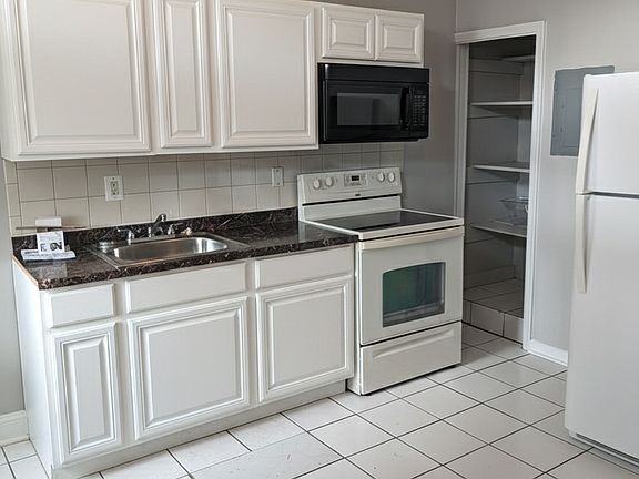 Updated Kitchen: Features crisp white cabinetry, durable dark countertops, and a white appliance suite including a built-in microwave and electric range.