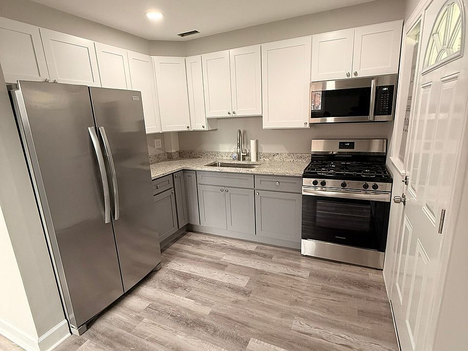 Gorgeous modern kitchen with brand-new stainless-steel appliances, shaker cabinets & granite countertops