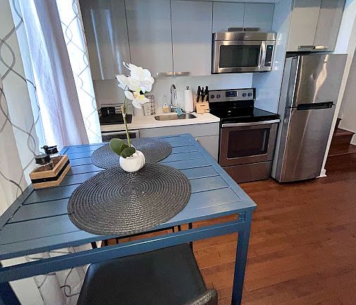 Our one bedroom units feature a secure building entrance. Key code/key entrances. 24 hr Video monitoring. They are upgraded with new furnishings and recently remodeled apts. with stainless appliances, new cabinets, in building laundry, wood flooring and marble countertops. Newly renovated building close to all tourist attractions and nestled in a quiet safe street in downtown Baltimore.