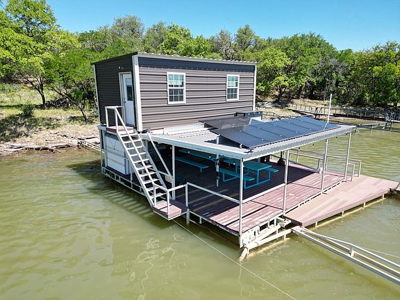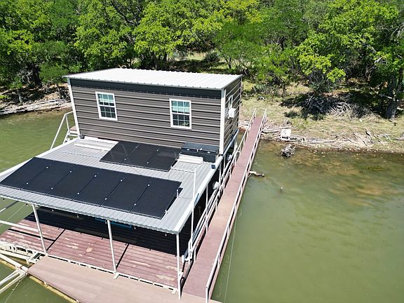 Your Private Slice of Lake Life on Goat Island at Lake Brownwood. Escape to the tranquility of Goat Island with this unique solar powered waterfront getaway on Lake Brownwood. This cozy 240 sq ft one-room cabin with bathroom offers the ultimate retreat for lake lovers, anglers, or anyone craving peace and privacy on the water. Enjoy two private docks—one 440 sq ft covered boat dock with a lift for boat and toy storage and a separate covered party dock, perfect for entertaining under the Texas sky. You'll have everything you need for endless on the lake enjoyment, including two picnic tables, a smoker for BBQ weekends, a 250-gallon septic tank pumped monthly for convenience and solar energy suppling electricity for all your needs! Whether you're fishing at sunrise, hosting sunset gatherings on the dock, or exploring the 94 acres of Goat Island, this spot is a rare chance to own a floating slice of paradise. No deed or title policy. Annual payments to due to the Brown County Water District for the lease of two water spaces.