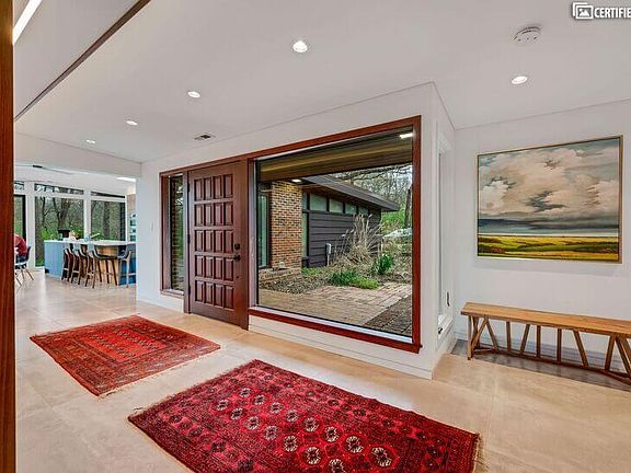 The furnished property is set on a 10.5-acre wooded estate and has all the important elements of mid-century modern design. Large expanses of glass, cedar, redwood and brick are set under a low-sloping roof line to take full advantage of the surrounding landscape and sun. It all blends into a hill to create a visual of luxury and calm. The restoration/renovation designed by architects Vinci Hamp was completed 2023 to update the house for the 21st century, while keeping its original charm.
