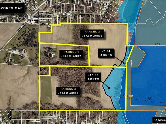 PARCEL #1: ±21.922 acres with house & barn. PARCEL #2: ±57.321 acres with frontage on Batdorf Rd. and access on Louise Ave. / Barnes Dr. This parcel includes a large portion of tillable ground, plus woods with the potential for hunting, recreation, or timber. PARCEL #3: ±79.050 acres