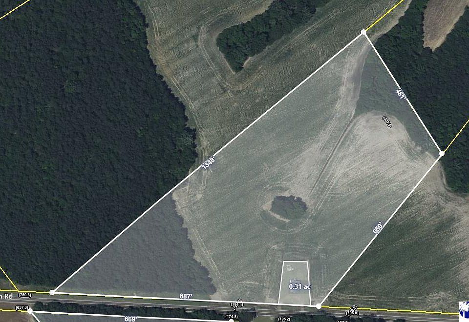 An estimated 12.5 acres with 770+/- feet frontage on Bay Branch Rd. About 2.5 acres wooded and approx. 10 acres tillable. To be sold subject to the current agricultural lease for 2023. The small frame house/lot (address 1472 Bay Branch) is excluded from above acreage.
