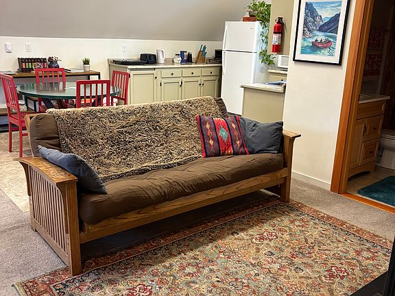 Welcome to this light and bright, high desert home on the northeast side of Bend. Your gated garden entrance leads to a shared outdoor garden, patio and stone firepit area. Juniper french doors open to a shared mud room with a cozy wood stove, foos ball table, and a muraled floor. Directly opposite, a single flight of stairs leads to the private, furnished studio. The spacious, carpeted space includes high ceilings, a comfortable queen bed, a private, tiled bathroom with closet, dining/living area with futon and TV, wall heater with adjustable temperature dial, portable air conditioner, and tiled kitchen with full sized fridge, sink, microwave, and two-burner stove top. Located in a quiet neighborhood with wide, paved streets and sidewalks, this artistic chalet home has everything you need. One dog considered on a case-by-case basis with pet deposit. Fenced garden area. Two months minumum lease length. All utilities included.