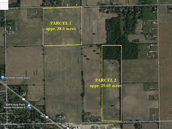 Parcel 2 - Bennington Rd. between 71 and South Reed Rd. in Vernon twnshp MI. 39.69 acres of prime farmland will be offered at Public Auction. Auction will be held on December 13th 7:00 pm at the Vernon Public Library - 115 E Main St, Vernon, MI 48476. Terms: This real estate sold ''as is'' with no contingencies. Real estate sold by legal description. Property sold free and clear of all liens, encumbrances, and back taxes, if any. Taxes will be pro-rated to the day of closing on a due date basis. A 10% buyer's premium will be added to the final bid on all real estate transactions. Real estate is sold with the seller's confirmation of high bid. Buyer to close within 30 days. Buyer must sign purchase agreement and provide a non-refundable deposit in the amount of $10,000.00 day of auction