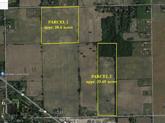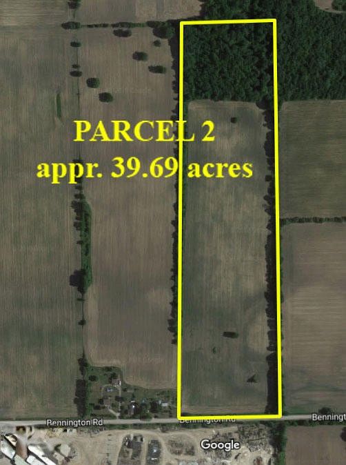 Parcel 2 - Bennington Rd. between 71 and South Reed Rd. in Vernon twnshp MI. 39.69 acres of prime farmland will be offered at Public Auction. Auction will be held on December 13th 7:00 pm at the Vernon Public Library - 115 E Main St, Vernon, MI 48476. Terms: This real estate sold ''as is'' with no contingencies. Real estate sold by legal description. Property sold free and clear of all liens, encumbrances, and back taxes, if any. Taxes will be pro-rated to the day of closing on a due date basis. A 10% buyer's premium will be added to the final bid on all real estate transactions. Real estate is sold with the seller's confirmation of high bid. Buyer to close within 30 days. Buyer must sign purchase agreement and provide a non-refundable deposit in the amount of $10,000.00 day of auction