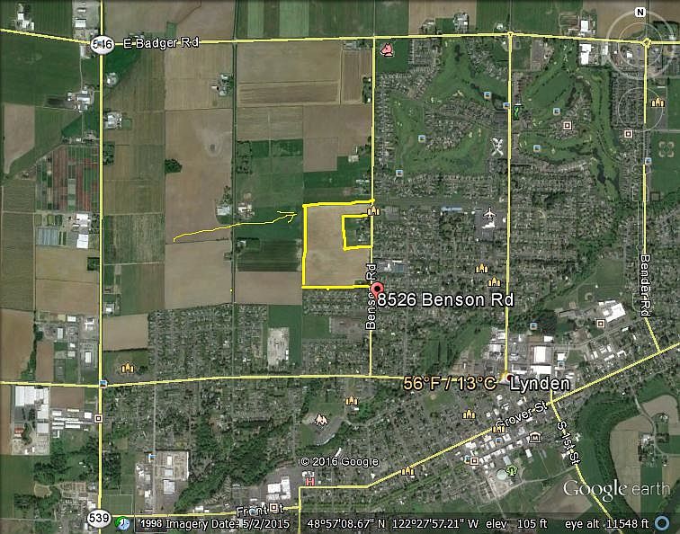 38+ Acres of Mixed Use Residential land on Benson Rd, in the city of Lynden, Washington. The property owner has an adjacent lot. A lot line adjustment is possible to divide the property into 2 parcels if a smaller parcel is desired.. All utilities are at the property line. The land has unobstructed views of Mt. Baker. The Canadian border is 3 miles away. Call 503 267 2686