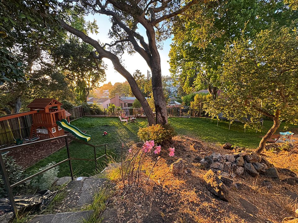 Spacious backyard features peekaboo views of the Bay, a big trampoline, play structure, gorgeous oak and camelia trees, and a newly planted fruit orchard.