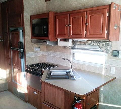 Large 30-foot, (approx. 300 sq ft); 5th wheel RV with a large slide out in living and dining areas and tall ceilings and features the following: