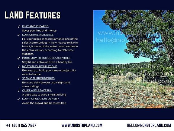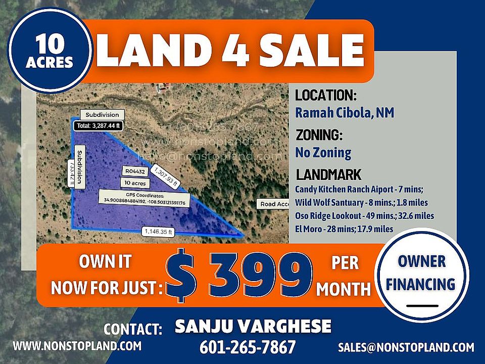 Vast 10-acre Lot in Cibola County NM to Build Your Dream Home! **************************** Contact Varghese to learn more: 601-265-7867 - sales@nonstopland.com **************************** *Flat and cleared *Low crime incident - For your peace of mind Ramah is one of the safest communities in New Mexico to live in. In fact, it is one of the safest communities in the entire nation, according to FBI crime statistics. *Proximity to outdoor activities - Stay fit and active and live a healthy lifestyle. *No zoning regulations - Extra easy to build your own dream project. No rules to hurdle. *Scenic surroundings - Be awed daily by your usual sight and surroundings. * Quiet and peaceful *Low population density - Avoid the crowd and be stress free **************************** The parcel sits on the Bodean Road Ramah. Use these coordinates to find the property via Google maps: 34.8996, -108.5019 or From Candy Kitchen Rd. turn to Bodean rd then turn left to Pine Crest Rd, right off the curve you will see the property on the left side. On this property you can build a Single-family stick built, Mobile home, Camping & RV. Power Access is within the area (Electrical Post). Buyer will have to set up a private well & septic system. **************************** Buyer must verify & work with the County to know what can & can't be done with the land, obtain proper permits if needed & confirm the availability of any utilities needed/serviced on the lots. Seller makes no warranties or representations about the land, its condition, or what can be built on the parcel. **************************** Build your dream home away from the noise of the city when you finally settle on this 10-acre lot we have for sale in Cibola County NM. This property is nestled in the city of Ramah just 1.2 miles away from Wild Spirit Wolf Sanctuary. Cibola County was created in 1981 out of the huge westernmost part of what was then Valencia County. Cibola County Land area is approximately 4,542 square miles. Cibola county borders McKinley County to the north, Bernalillo County to the east, Catron County to the south, and Apache County, Arizona to the west. **************************** Purchasing property from us is quick & effortless. This property will be closed by a local title company & is guaranteed to be free of all liens and encumbrances. Buyer will receive title insurance & warranty deed. Message us here/call us today to get started. **************************** You can purchase this land with cash for $15,997, other payment options available. **************************** Property Details: Lot Type: Land Sale Price: $15,997 APN (Assessor’s Parcel Number): 2092044486484 Acreage: 10 Acres State: NM County: Cibola County City: Ramah Street: Bodean Road Road Access & Type of Road: Candy kitchen rd – Bodean rd.- Pine cresst rd – Wee ln Plated Dirt Road Zoning: No Zoning Terrain: Pretty Sandy and Wooded Elevation: 7500 ft HOA/POA: No Mobile Home Allowed? Yes Time Limit to Build: None Annual Taxes: $151.76 **************************** To buy this lot at this discounted price call/txt/email Varghese. Don't miss out on this great deal call/text us now! Note: We also may have other property at bargain prices just like this one available - ask us when you call!
