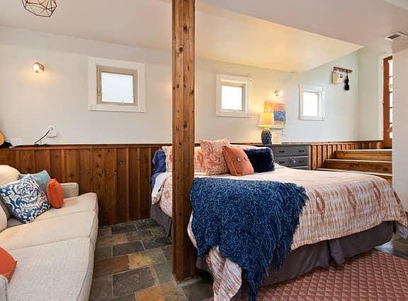 The main living space is equipped with a King size bed, and a large comfortable couch. There is closet space for hanging clothes and a dresser for storing personal items. All bedding and linens are comfortable and high quality. Flat screen SMART TV with cable, make for a great night of lounging. Catch up on your favorite Netflix series or watch a movie on Cable or Amazon!