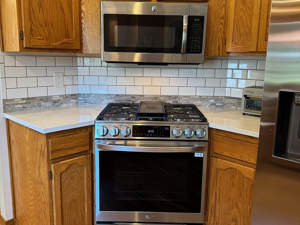 - Gas range, microwave, toaster oven, dishwasher, garbage disposal