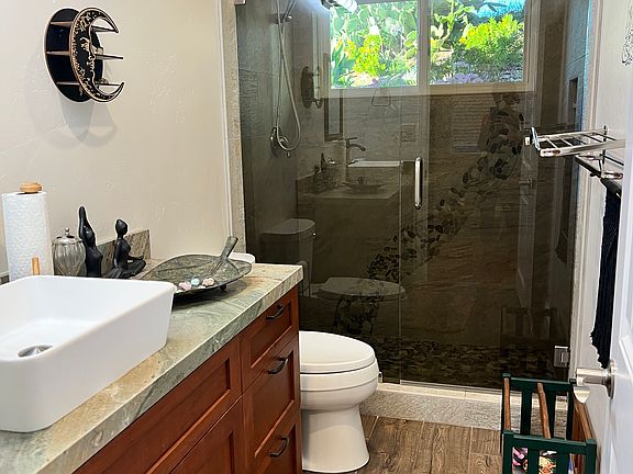 This furnished ADU is set on a private, gated 2-acre rural property in Bonsall that was previously used as a yoga and retreat center, giving it a natural peaceful and restorative feel. Guests have access to a pool and Jacuzzi, walking paths, and a labyrinth, along with seasonal fruit from the property and fresh eggs from our chickens.
