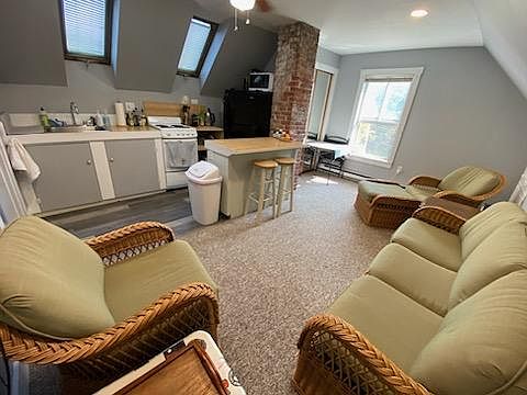 Fully furnished in boothbay harbor. This comfy 1 bedroom loft (3 room) penthouse apartment boasts a HUGE outdoor sun deck with a sweeping treetop view. Tennant pays utilities. The house is located on a quiet side street in one of Boothbay Harbors finest neighborhoods within walking distance of downtown. This one bedroom features a sleeping loft that is perched at the very top of the house crows-nest style. It has new fridge and open concept kitchen-living room. Plenty of sun in a peaceful setting. Walk to waterfront, shops, restaurants, grocery store and laundry. 1450 rent includes 1 private parking space, water, sewer, lawn care and sole use of huge deck. Tenant pays electric/internet and takes trash to transfer station 1 mile away. Laundry is a 2 min drive. Fully furnished, just bring your belongings. ONE off stree parking spot. Due to insurance reasons, no pets. First, plus security to move in, no smokers/no pets. Quiet, friendly and safe neighborhood. Application, credit check, references are required. Avail now. Message for immediate info, to view and fill out application.